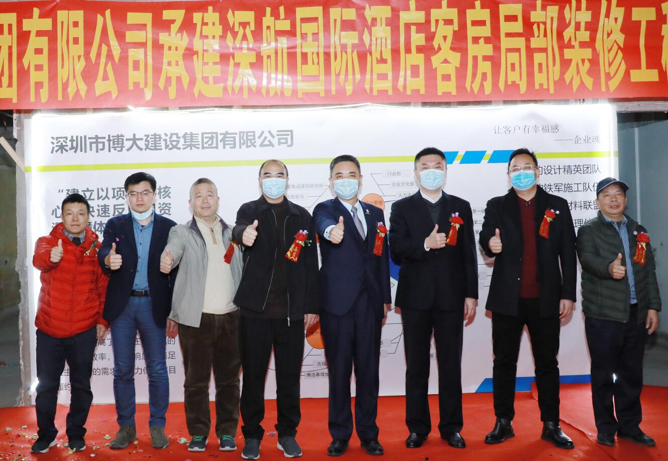 2021年1月14日,在開完深航國際酒店客房局部裝修工程第一次工地會議后,集團副董事長黃河、第三戰區總經理徐朝華與深航基建處副總經理陳新、深航基建處工程管理中心譚波、深航酒店副總經理肖強、深圳市中安項目管理有限公司總經理趙坤強等一行領導參加了深航國際酒店開工典禮剪彩儀式。