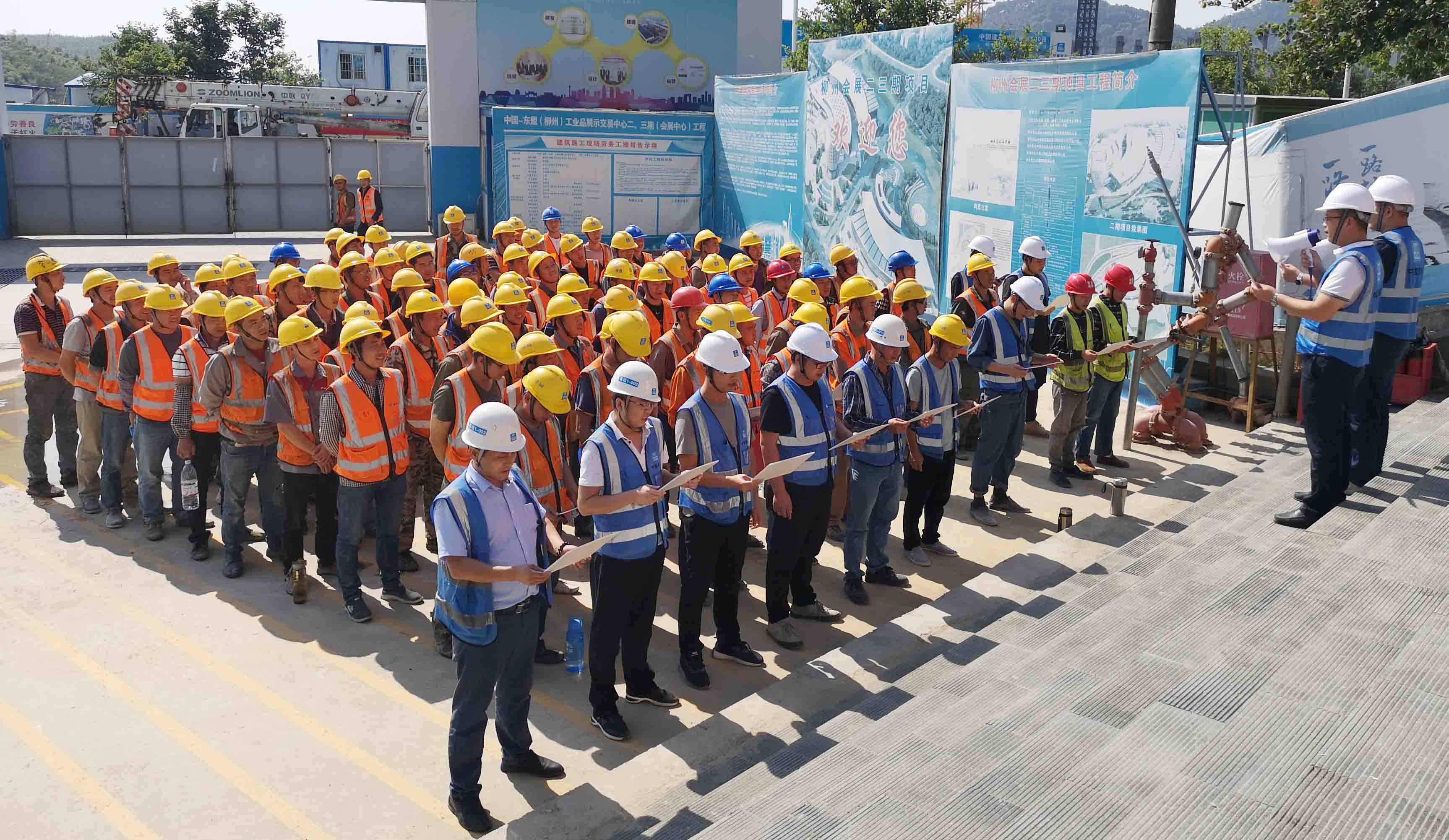 中國-東盟(柳州)工業品展示交易中心二三期(會展中心)項目工地現場宣誓聲響徹云霄。11月1日上午,柳州會展二、三期項目共同召開確保“12?30”節點目標誓師動員大會,博大建設集團作為重要參建單位,集團董事、副董事長黃河親臨現場,與甲方簽訂“軍令狀”。